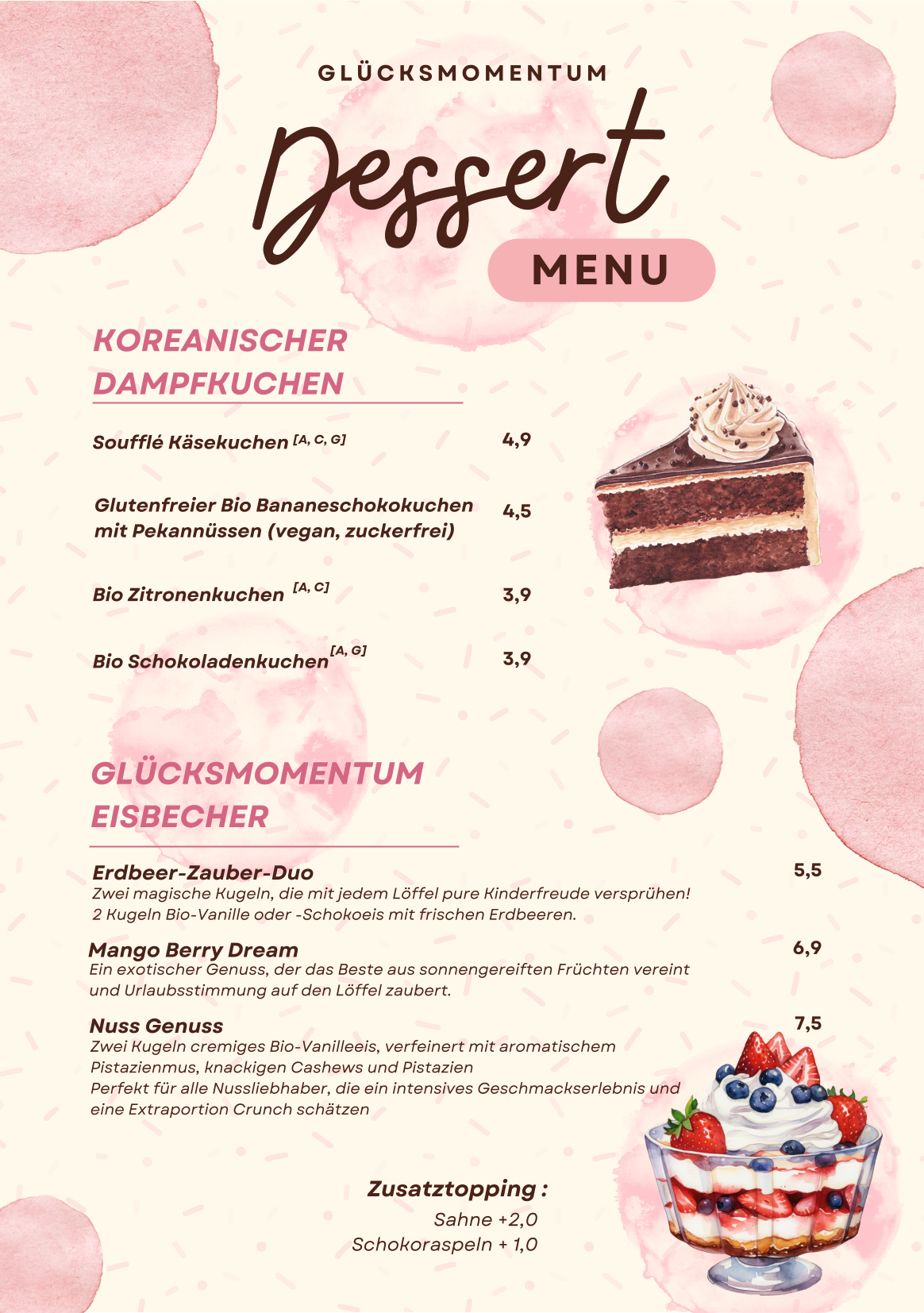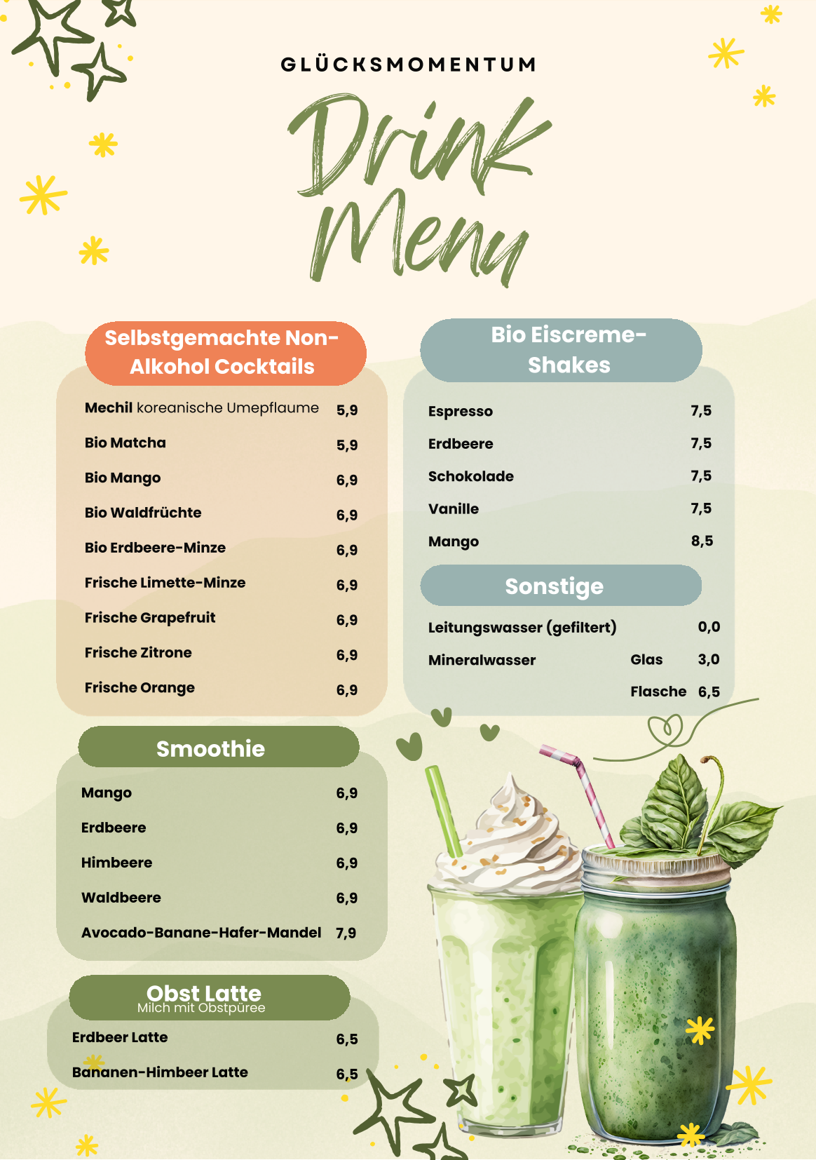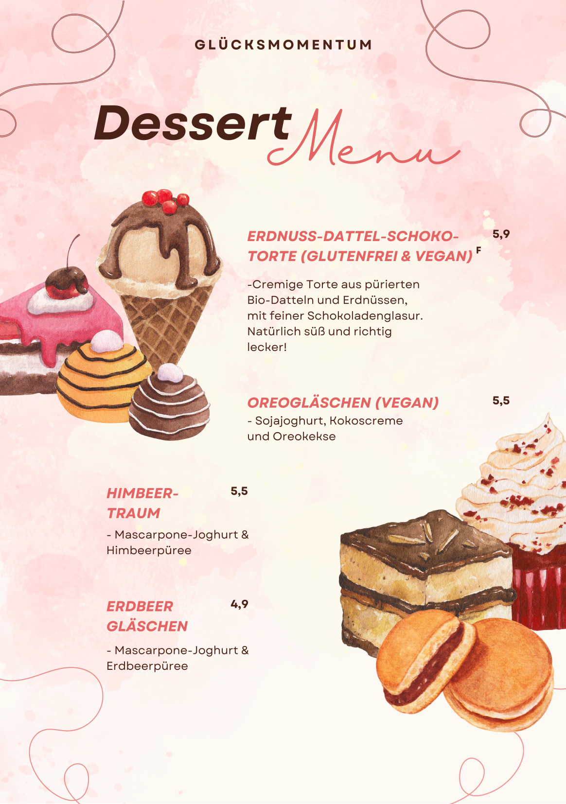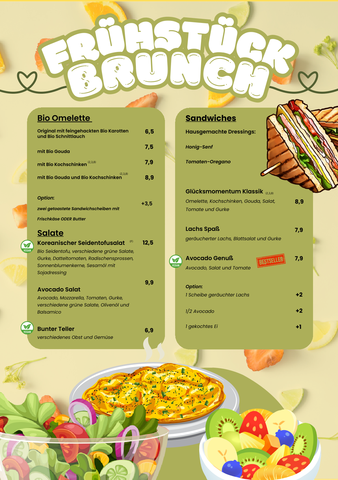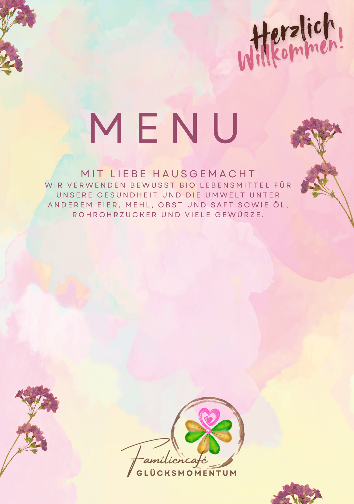 Entdecken Sie unser abwechslungsreiches Menü und erleben Sie nachhaltigen Genuss im Familiencafé Glücksmomentum. Haben Sie spezielle Wünsche oder möchten Sie mehr über unsere Zutaten erfahren? Kontaktieren Sie uns gerne!